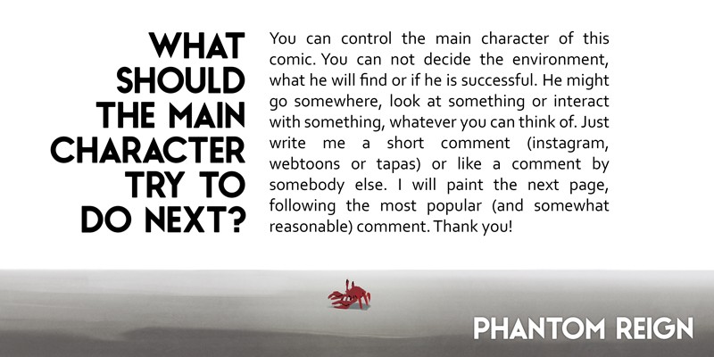 PHANTOM REIGN is an interactive webcomic! You can control the main character, but not the environment, other characters or if he is successful. He might go somewhere, interact with something, examine, fight, build, cook, ... whatever you can think of. Just write me a comment or like a comment by somebody else. I will paint the next page, following the most popular comment on instagram, tapas or webtoons and put the initials of the winner into one of the panels. I would love to read your ideas!