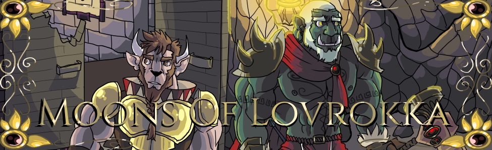 An orc barbarian, satyr knight, and human sorceror are swept away in the lore of the world of Lovrokka.